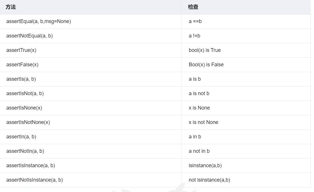 在python基础中,我们有讲过一个assert断言,使用方法比较简单,即assert 表达式, 提示信息,而unittest框架中也提供了一个自带的断言方式,主要有以下几种: