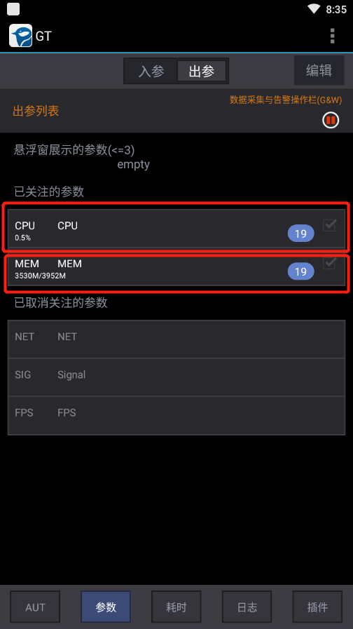 - 打开GT进⼊到AUT界⾯,选择被测试的app,勾选NET指标