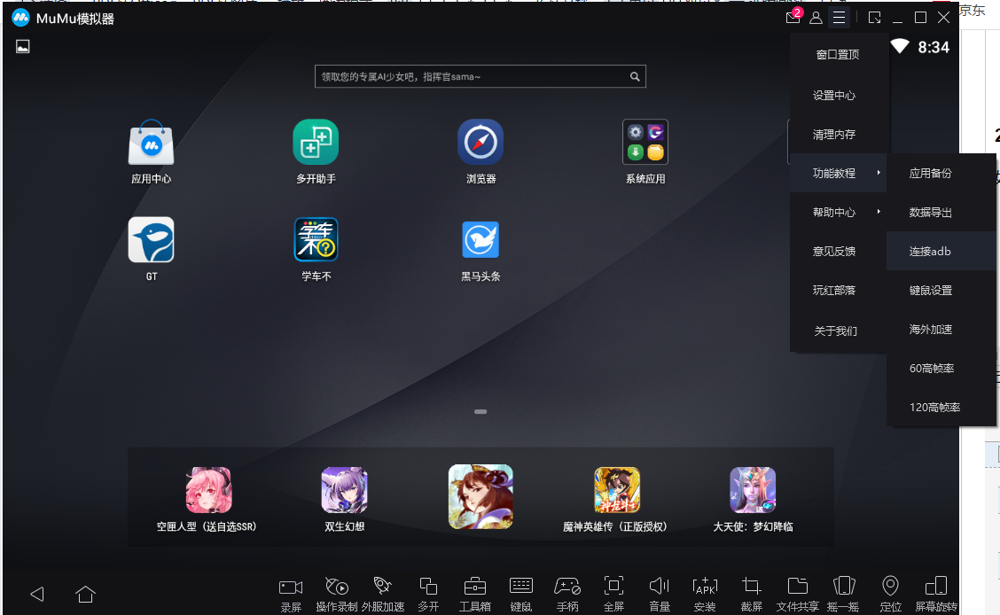 1.打开MuMu模拟器,点击右上角三条杠-功能教程-连接adb,然后跳转到网页复制MuMu模拟器的端口