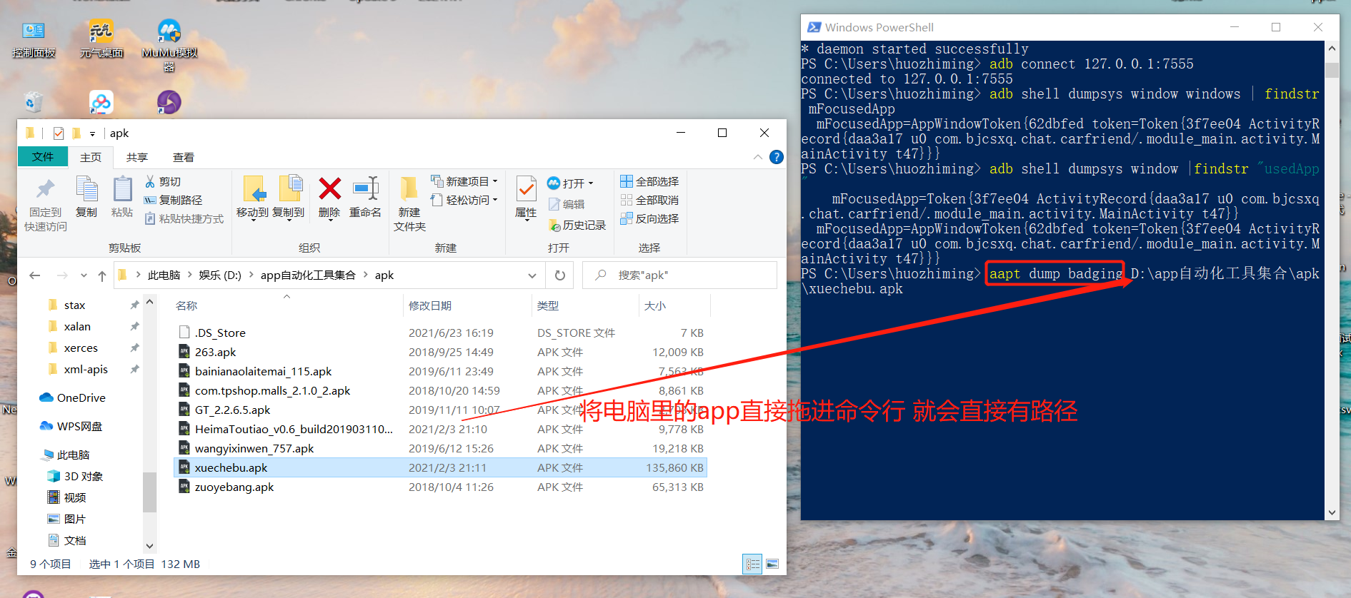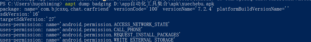 aapt dump badging D:\BaiduNetdiskDownload\apptools\apk\xuechebu.apk 后⾯表示的是app安装包的路径及名称