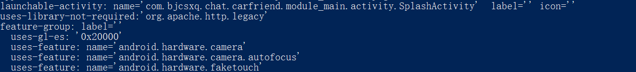 界⾯名: launchable-activity:name='com.bjcsxq.chat.carfriend.module_main.activity.SplashActivity' launchableactivity: name后⾯的字符串是界⾯