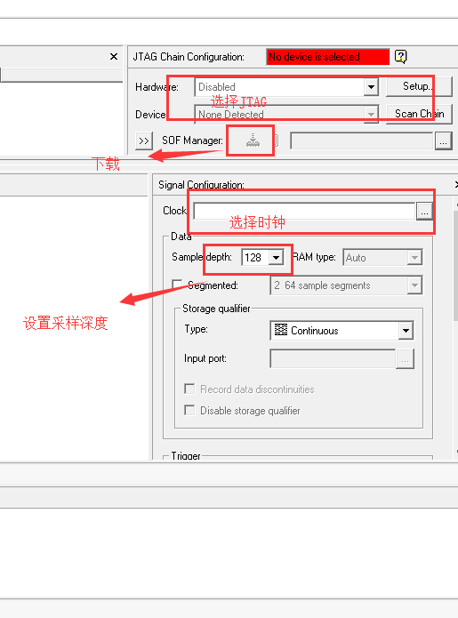 3.添加时钟,配置JTAG下载,在此界面中可以直接下载