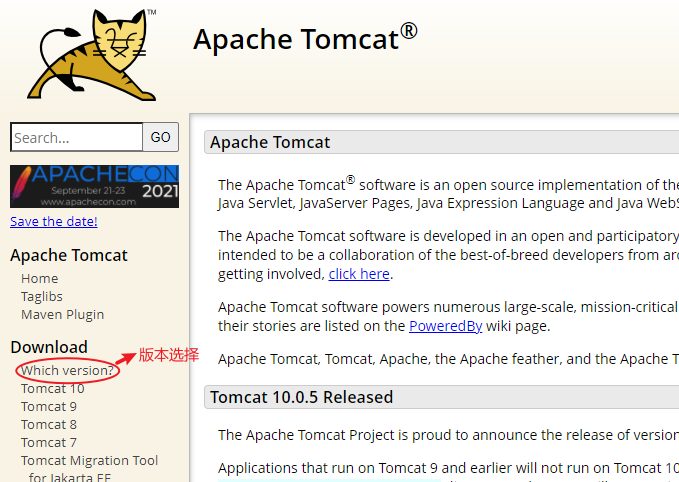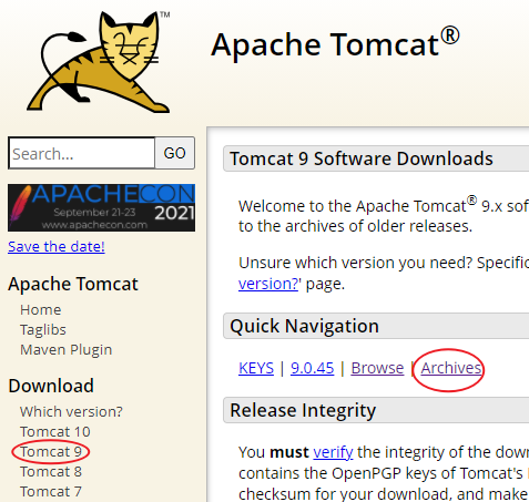 (3)我的Java版本是Java8,用Tomcat9.0.x作示范,点击红圈处的Archives可