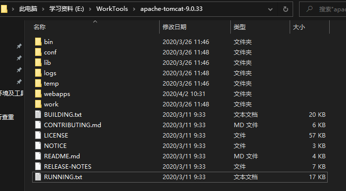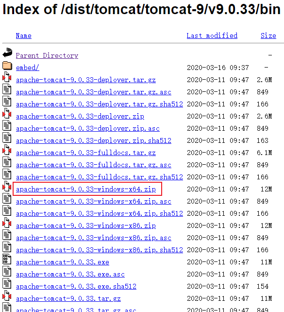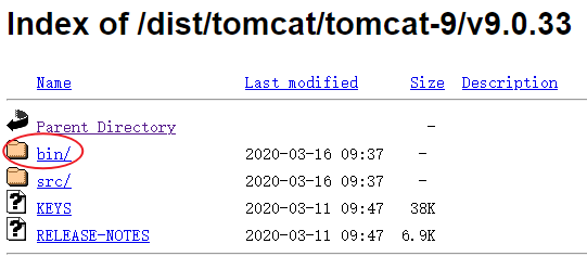 以看到截至目前所有的版本,根据需求下载,以Tomcat9.0.33为例。
