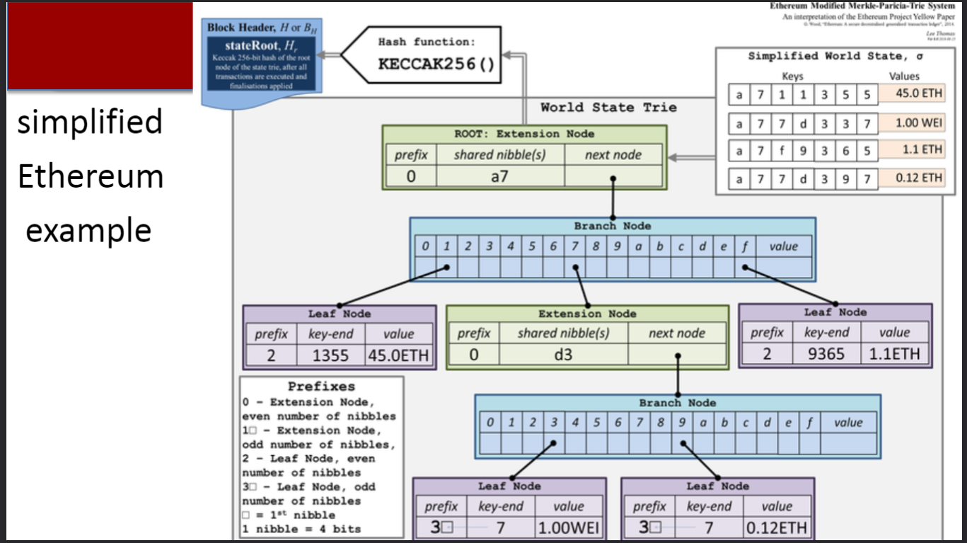 MPT树中另外一个重要的概念是一个特殊的十六进制前缀(hex-prefix, HP)编码,用来对key进行编码。因为有两种[key,value]节点(叶节点和扩展节点),所以需要对它们进行区分。此时,引进一种特殊的标识(一个bit即可)来标识key所对应的是值是叶子,还是其他节点的hash。如果标识符是1,那么key对应的是叶节点,反之则是扩展节点。