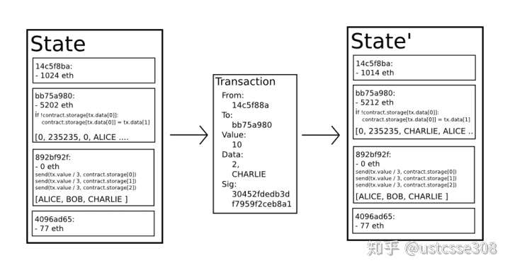 为了实现账户方式,以太坊的做法是采用状态(state)的概念存储一系列账户,每个账户都有自己的余额,以及以太坊特有的数据(代码或内部存储器)。