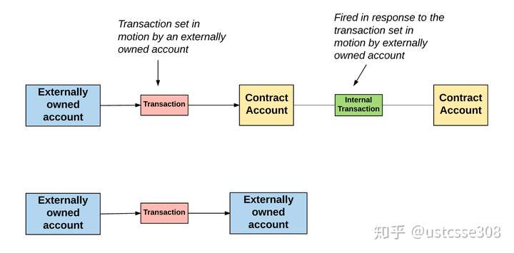不像外部拥有账户,合约账户不可以自己发起一个交易。相反,合约账户只有在接收到一个交易之后 (从一个外部拥有账户或另一个合约账户接),为了响应此交易而触发一个交易 。我们将会在“交易和消息”部分来了解关于合约与合约之间的通信。