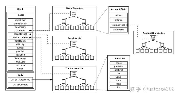 以太坊在区块头部中会包括三棵树,分别是世界状态树(world state trie),交易树(transaction trie)以及receipt树。