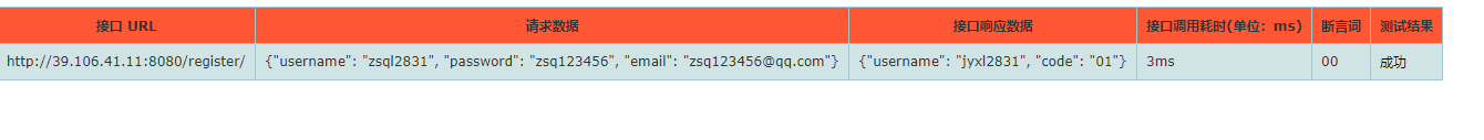 data = [('http://39.106.41.11:8080/register/', '{"username": "tiansl2831", "password": "wulaoshi123451", "email": "wulaoshi@qq.com"}', '{"username": "tiansl2831", "code": "01"}',"5ms","00", '成功')]