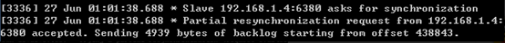 当复制缓冲区溢出时,主节点打印日志如下所示: