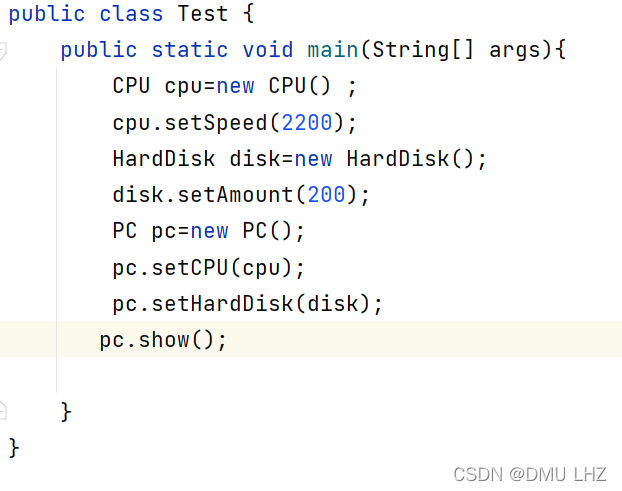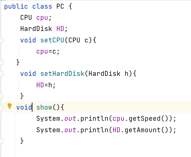 其中,CPU类要求getSpeed()返回speed的值,要求setSpeed(int m)方法将参数m的值赋值给speed;HardDisk类要求getAmount()返回amount的值,要求setAmount(int m)方法将参数m的值赋值给amount;PC类要求setCPU(CPU c) 将参数c的值赋值给cpu,要求setHardDisk (HardDisk h)方法将参数h的值赋值给HD,要求show()方法能显示cpu的速度和硬盘的容量。