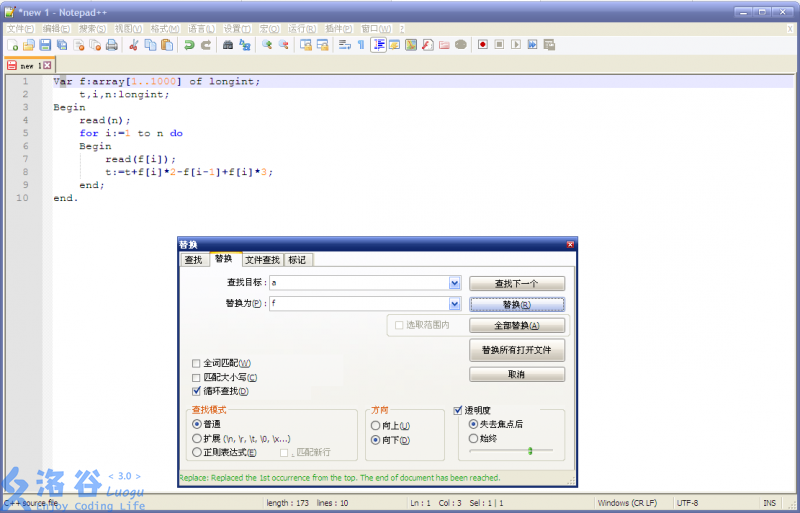 上面的程序中出现了许许多多次数组a,此时,如果你想把a都变成f呢?使用替换功能了(当然手动改我也不阻拦)