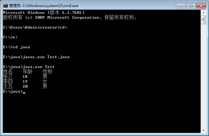 System.out.print("王五\t20\t男");