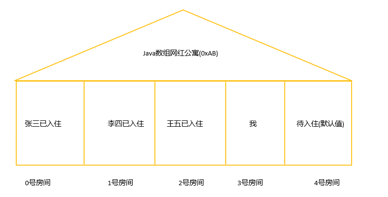 - 当这个公寓创建好了之后,因为它是连续的,因此,我们根据房间号就可以直接找到该房间,这个房间号在Java中称之为下标/脚标,用于标记数组中元素的位置