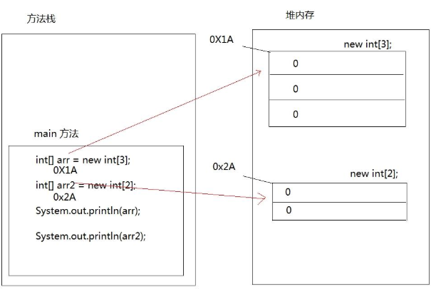 public static void main(String[] args) { int[] arr = new int[3]; int[] arr2 = new int[2]; System.out.println(arr); System.out.println(arr2); }执行流程
