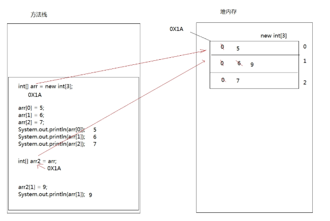 public static void main(String[] args) { // 定义数组,存储3个元素 int[] arr = new int[3]; //数组索引进行赋值 arr[0] = 5; arr[1] = 6; arr[2] = 7; //输出3个索引上的元素值 System.out.println(arr[0]); System.out.println(arr[1]); System.out.println(arr[2]); //定义数组变量arr2,将arr的地址赋值给arr2 int[] arr2 = arr; arr2[1] = 9; System.out.println(arr[1]); } }执行流程