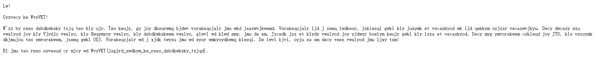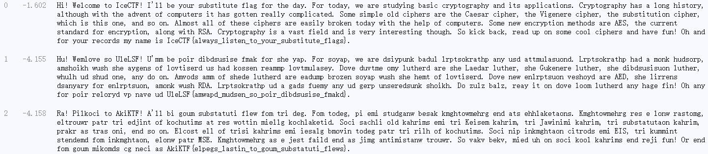 很明显是一堆乱码,观察发现最后的一串和答案接近,但尝试凯撒密码不正确,换种思路利用词频分析得到以下几种文本