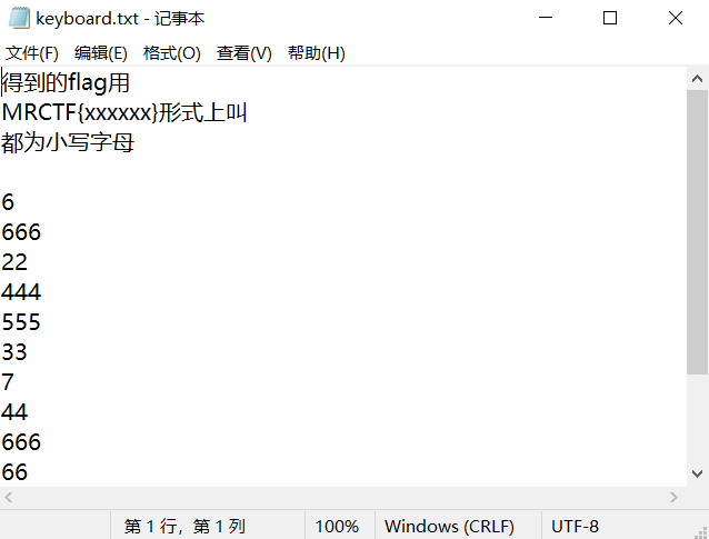文本由数字构成并未包含什么有效信息,观察题目名为keyboard,数字位数最多为三猜想是九键输入法数字代表具体是哪一键,位数表示该键中哪一个字母,最终转换为答案