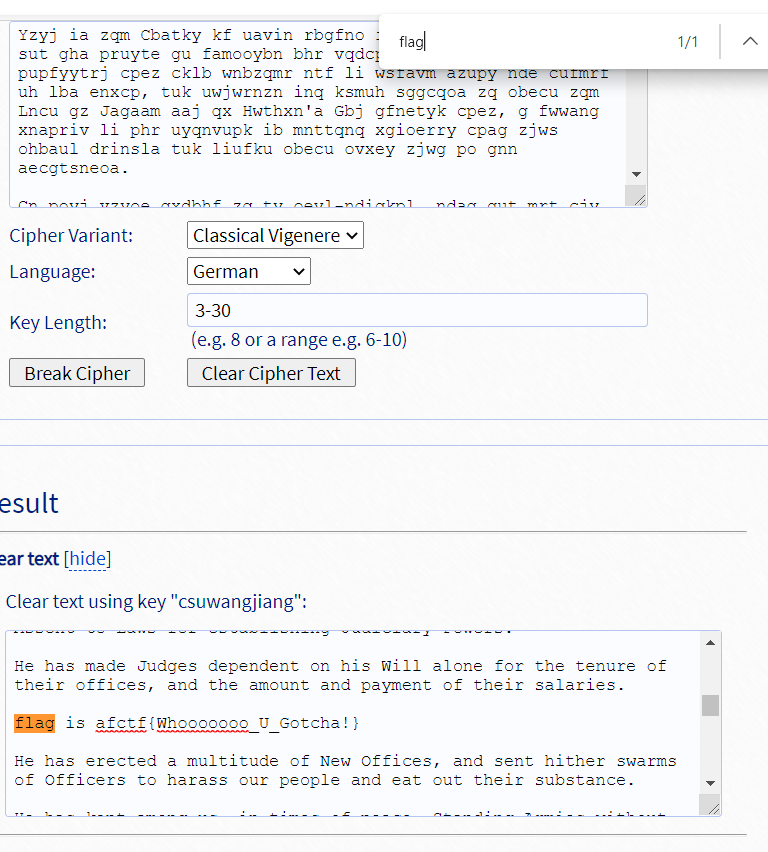 题目名为[AFCTF2018]Vigenère,直接将文档二放在Vigenere里面暴力破解,破解后搜索flag得到答案