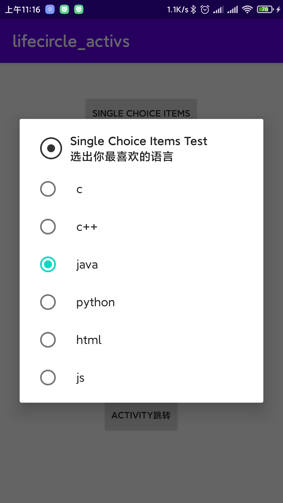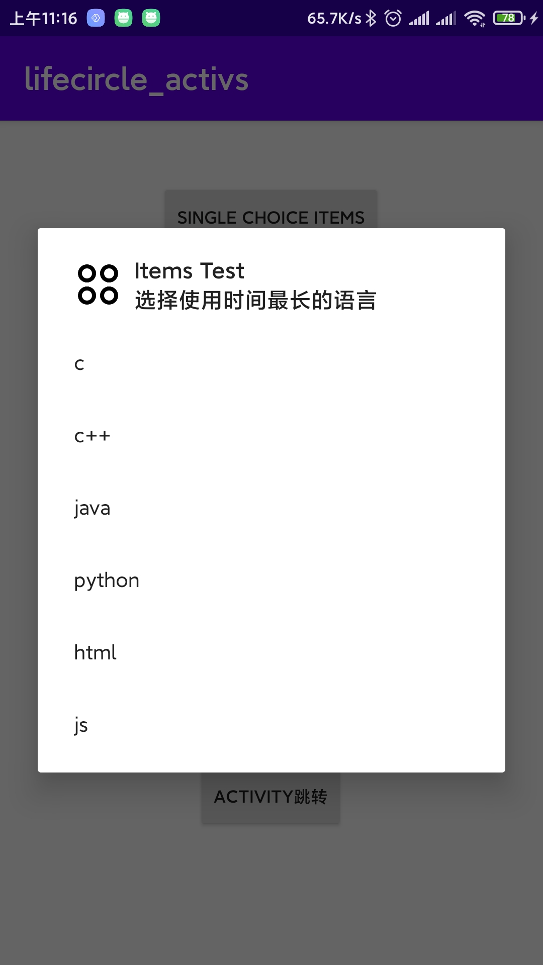 builder.setTitle("Single Choice Items Test"+"\n"+"选出你使用过的语言");