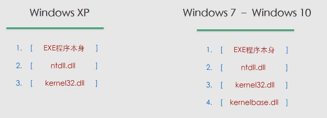 1 00404830 mov eax,dword ptr fs:[0x30] // PEB = FS:[0x30] 2 00404836 mov eax,dword ptr ds:[eax+0xC] // PEB_LDR_DATA = [PEB+0xC] 3 00404839 mov eax,dword ptr ds:[eax+0xC] // InLoadOrderModuleList 使用模块加载顺序遍历 4 0040483C mov eax,dword ptr ds:[eax+0x18] // eax = 00400000(LDR_DATA_TABLE_ENTRY.DllBase) 第一个DLL模块基址 1 00404830 mov eax,dword ptr fs:[0x30] // PEB = FS:[0x30] 2 00404836 mov eax,dword ptr ds:[eax+0xC] // PEB_LDR_DATA = [PEB+0xC] 3 00404839 mov eax,dword ptr ds:[eax+0x14] // InMemoryOrderModuleList 使用模块在内存中的顺序遍历 4 0040483C mov eax,dword ptr ds:[eax+0x10] // eax = 00400000(LDR_DATA_TABLE_ENTRY.DllBase) 第一个DLL模块基址 1 00404830 mov eax,dword ptr fs:[0x30] // PEB = FS:[0x30] 2 00404836 mov eax,dword ptr ds:[eax+0xC] // PEB_LDR_DATA = [PEB+0xC] 3 00404839 mov eax,dword ptr ds:[eax+0x1C] // InMemoryOrderModuleList 使用模块初始化时的顺序遍历 4 0040483C mov eax,dword ptr ds:[eax+0x8] // eax = 776C0000(LDR_DATA_TABLE_ENTRY.DllBase) 第一个DLL模块基址