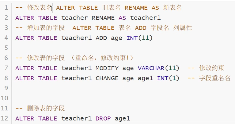 如:ALTER TABLE teacher2 CHAGE age age1 INT(1)