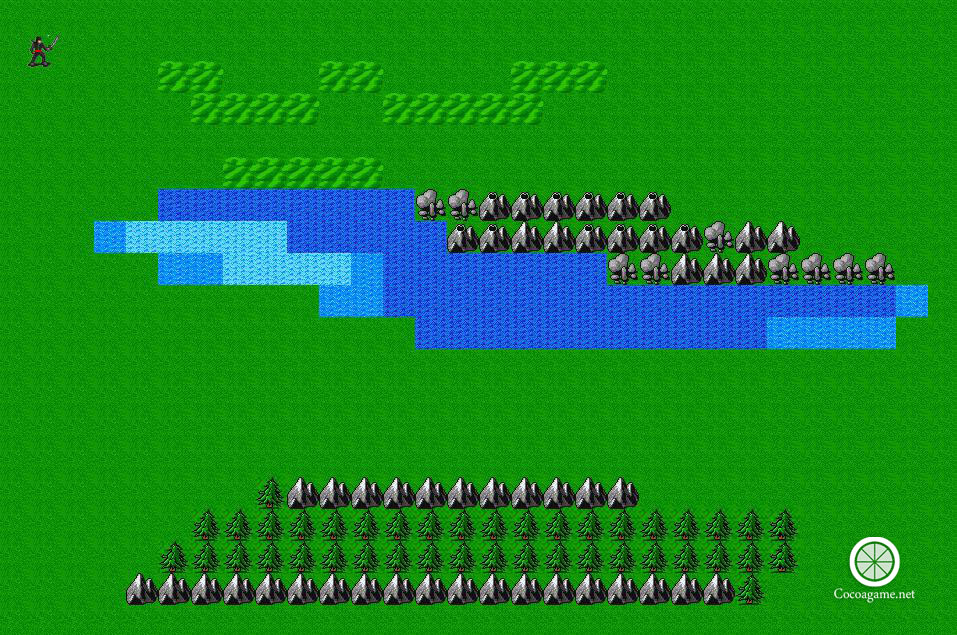实例比较简单,如图所示,地图上有一个忍者精灵,玩家点击他周围的上、下、左、右,他能够向这个方向行走。当他遇到障碍物后是无法穿越的,障碍物是除了草地以为部分,包括了:树、山、河流等。