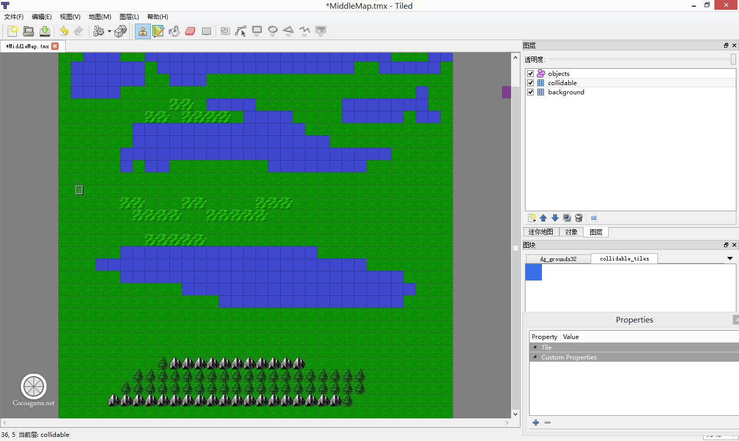 到目前为止我们游戏中的精灵,可以穿越任何障碍物。为了能够检测到精灵是否碰撞到障碍物,我们需要再添加一个普通层(collidable),它的目的不是现实地图,而是检测碰撞。我们在检测碰撞层中使用瓦片覆盖background层中的障碍物之上,如图所示。