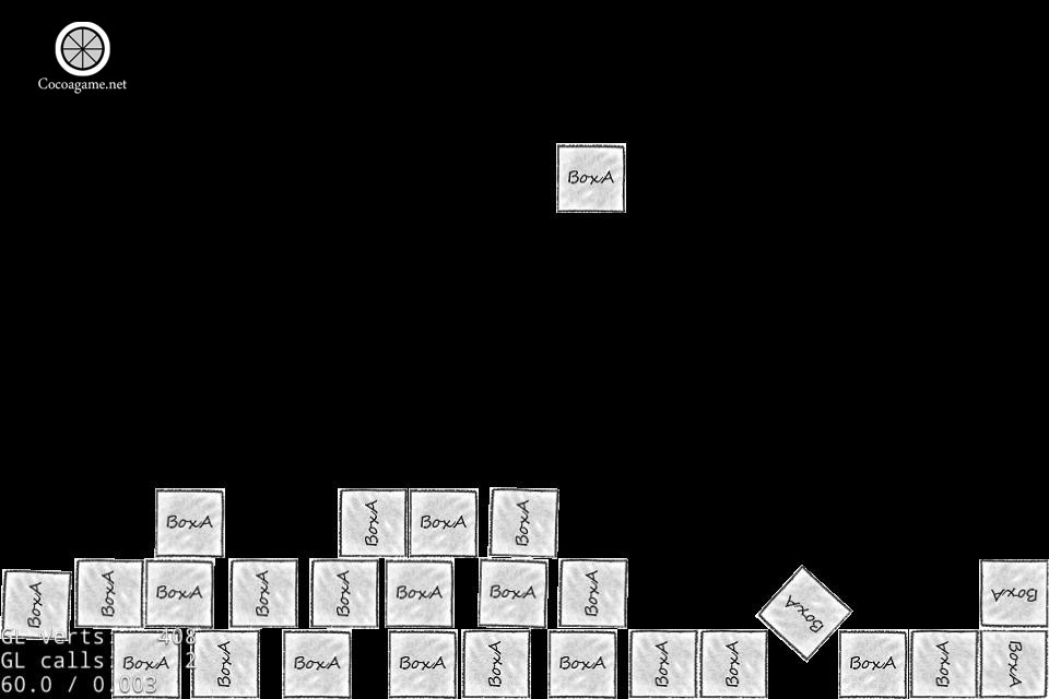我们通过一个实例介绍一下,在Cocos2d-JS中使用Chipmunk物理引擎的开发过程,熟悉这些API的使用。这个实例运行后的场景如下图所示,当场景启动后,玩家可以触摸点击屏幕,每次触摸时候,就会在触摸点生成一个新的精灵,精灵的运行自由落体运动。