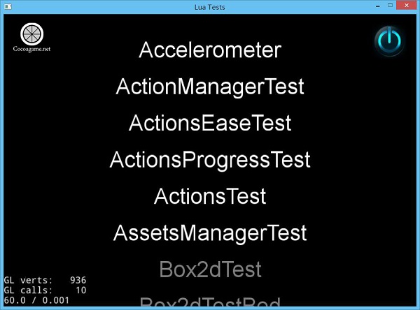 首次运行需要编译Cocos2d-x时间会长一些,运行起来之后会看一个Windows的窗口(如上图所示),点击其中的一个菜单项可以运行相应的示例(如下图所示)。