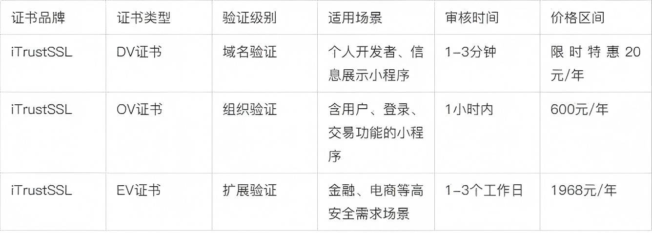 开发微信小程序的开发者一般会比较倾向于使用iTrustSSL证书,这是一款全球可信、兼容性强、高性价比的国产品牌SSL证书,支持主流的加密方式(ECC、RSA)、支持中国区 OCSP、特别适用于个人网站、企业官网、API服务、APP、小程序等业务应用场景,企具体对比如下: