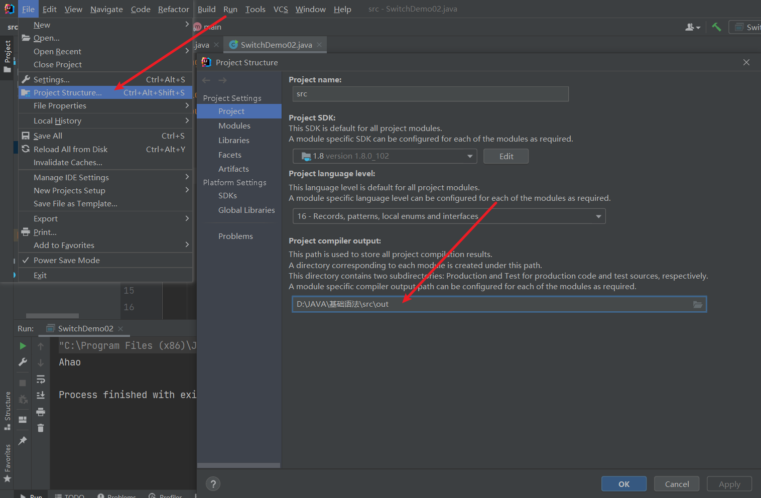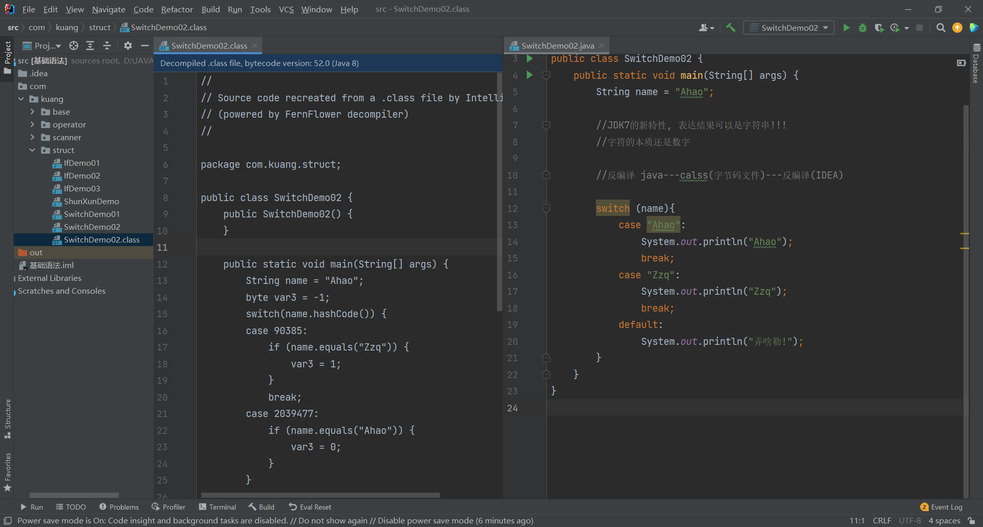 package com.kuang.struct; //===================== //Demo02 //===================== public class SwitchDemo02 { public static void main(String[] args) { String name = "Ahao"; //JDK7的新特性, 表达结果可以是字符串!!! //字符的本质还是数字 //反编译 java---calss(字节码文件)---反编译(IDEA) switch (name){ case "Ahao": System.out.println("Ahao"); break; case "Zzq": System.out.println("Zzq"); break; default: System.out.println("弄啥勒!"); } } }