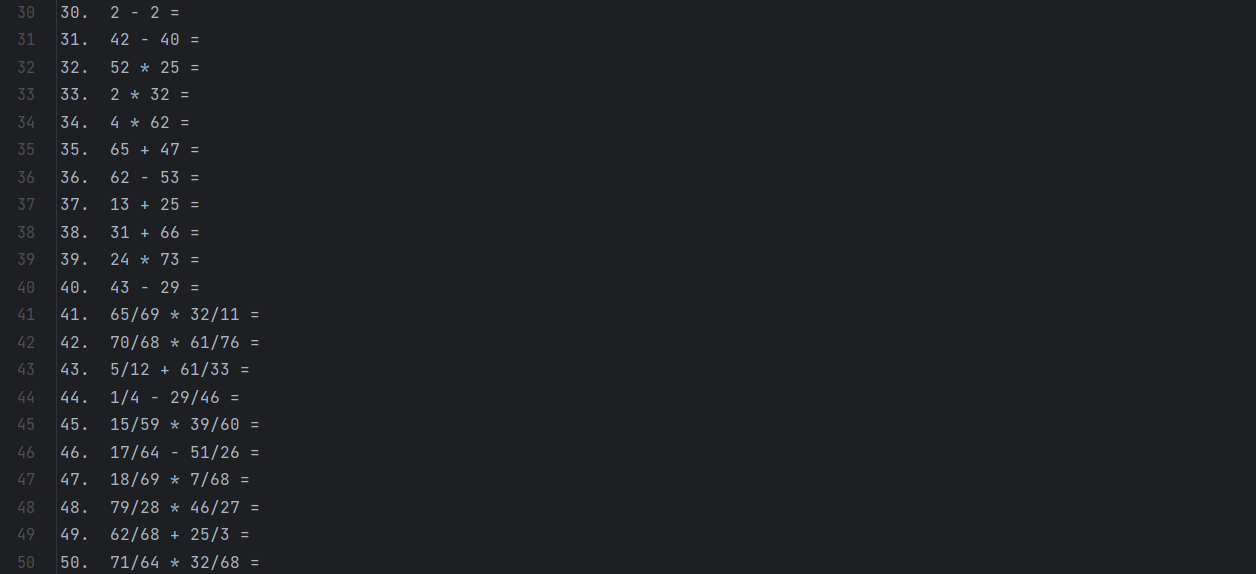 test.append((count + 1) + ". " + a + " " + operator + " " + b + " = " + "\n");