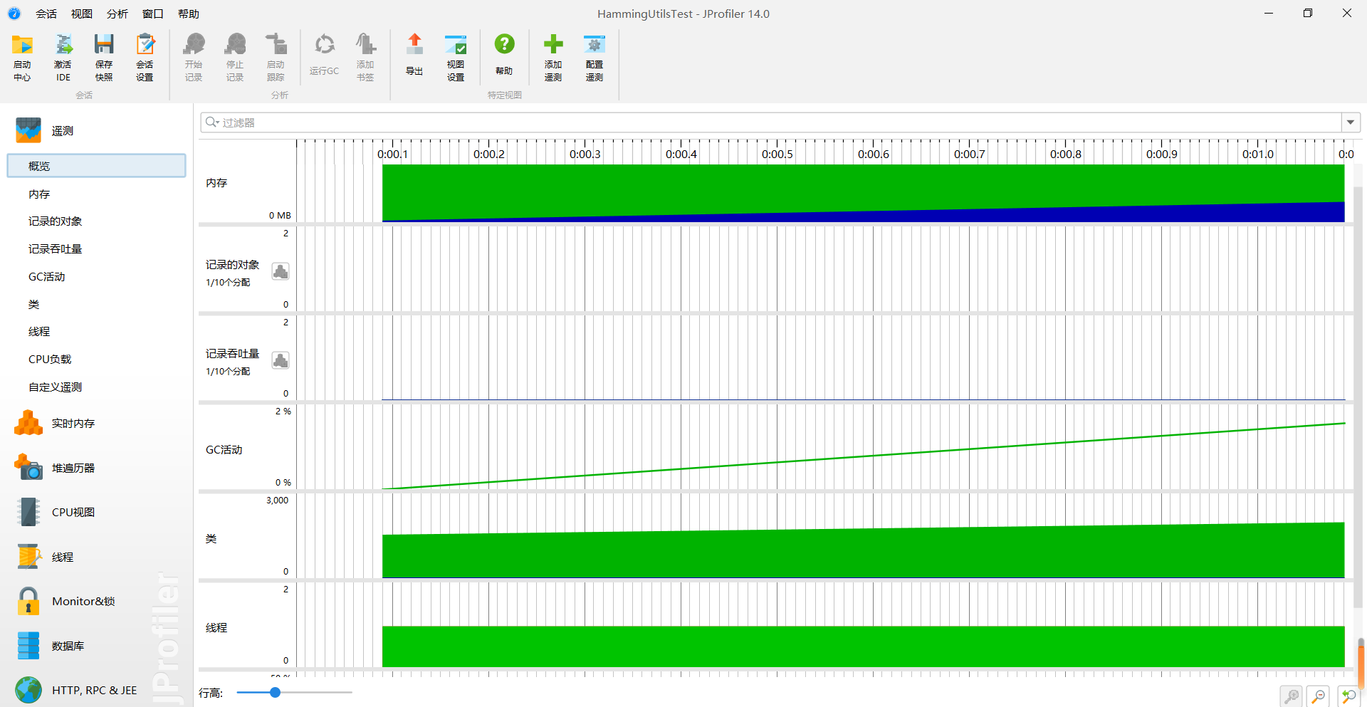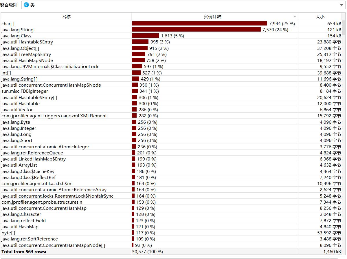 从上图可以看出,在该程序中,字符数组char[ ]和String类占用最多的内存,这主要与运算符号、题目文本及答案文本等的生成和文件写入时,调用了一系列List类方法、String类方法有关。