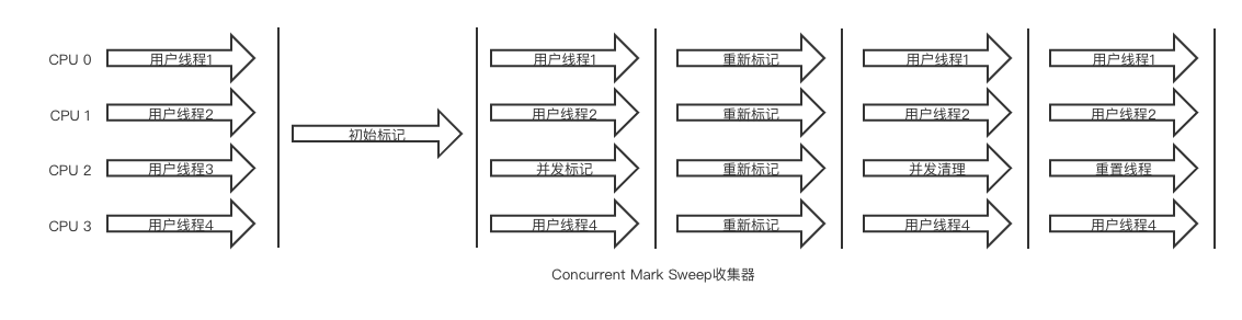 CMS整个过程比之前的收集器要复杂,整个过程分为4个主要阶段,即初始标记阶段、并发标记阶段、重新标记阶段和并发清除阶段。