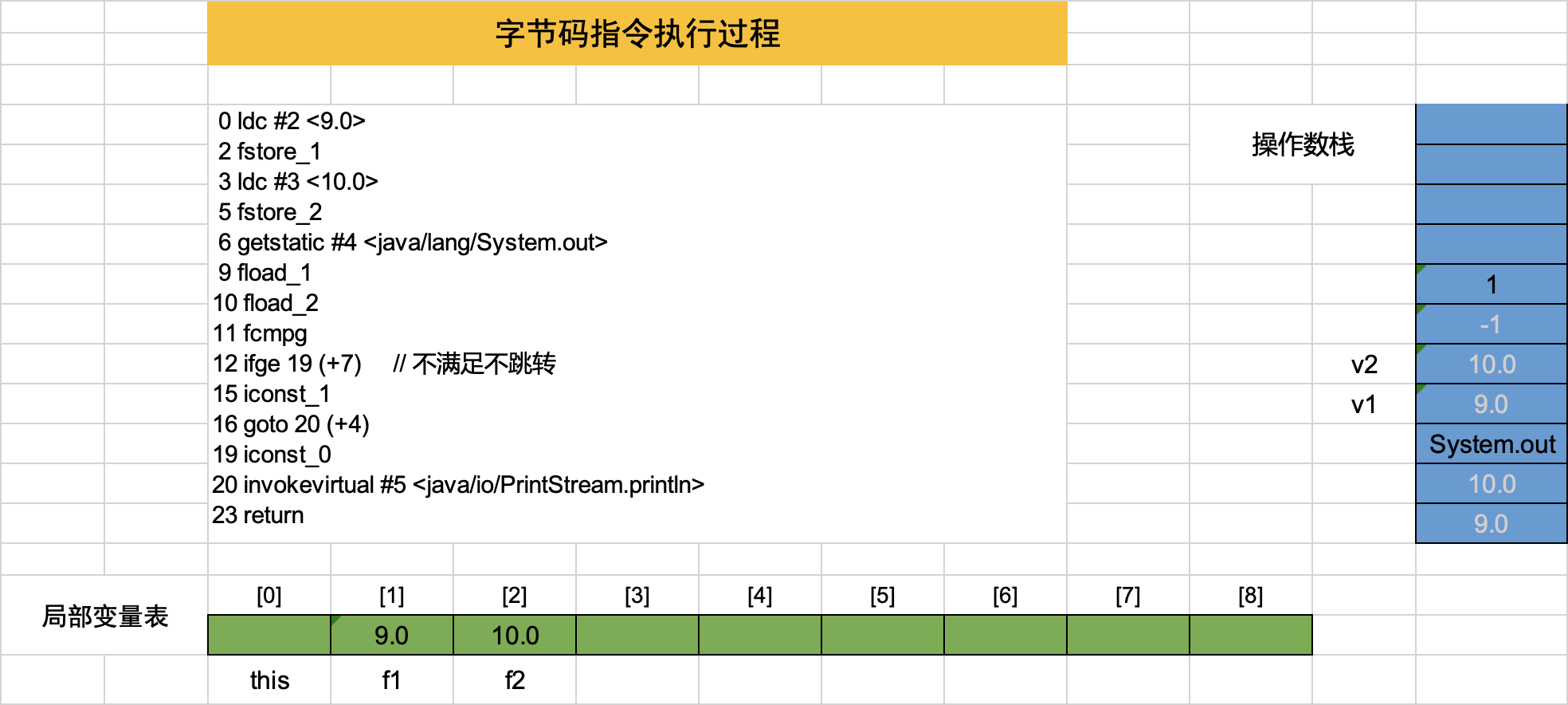指令 fcmpg和fcmpl都从栈中弹出两个操作数,并将它们做比较,设桟顶的元素为v2,栈顶顺位第2位的元素为v1,若v1=v2,则压入;若v1>v2则压入1;若v1 < v2则压入-1。