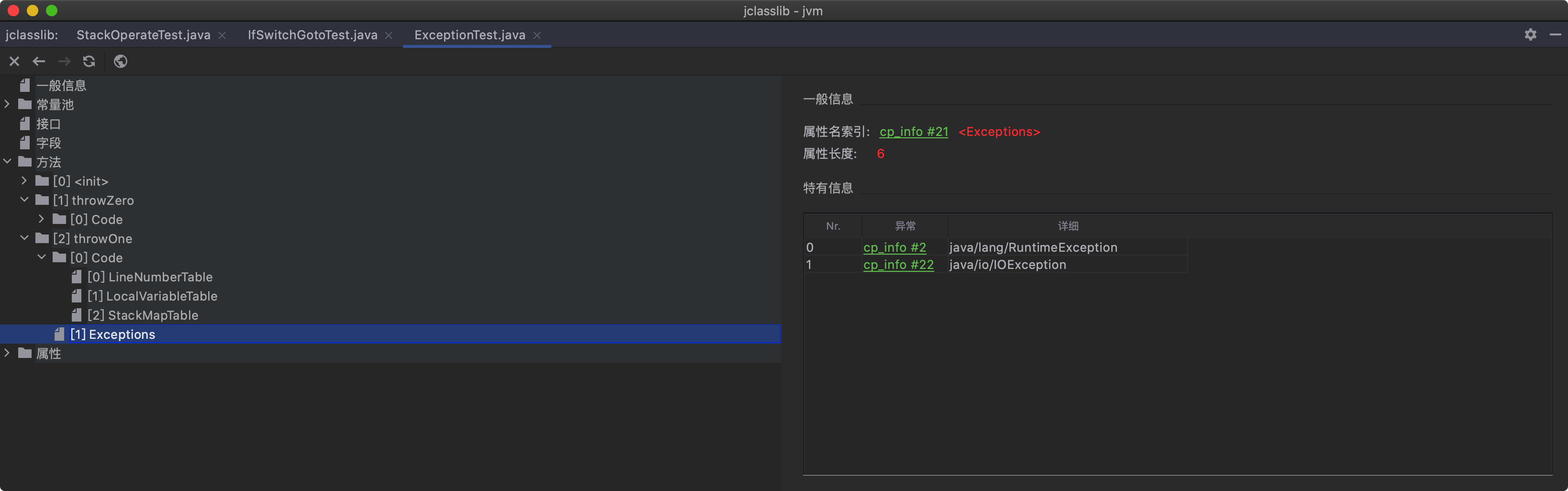 在Java虚拟机中,处理异常(catch语句)不是由字节码指令来实现的(早期使用jsr、ret指令),而是采用异常表来完成的。
