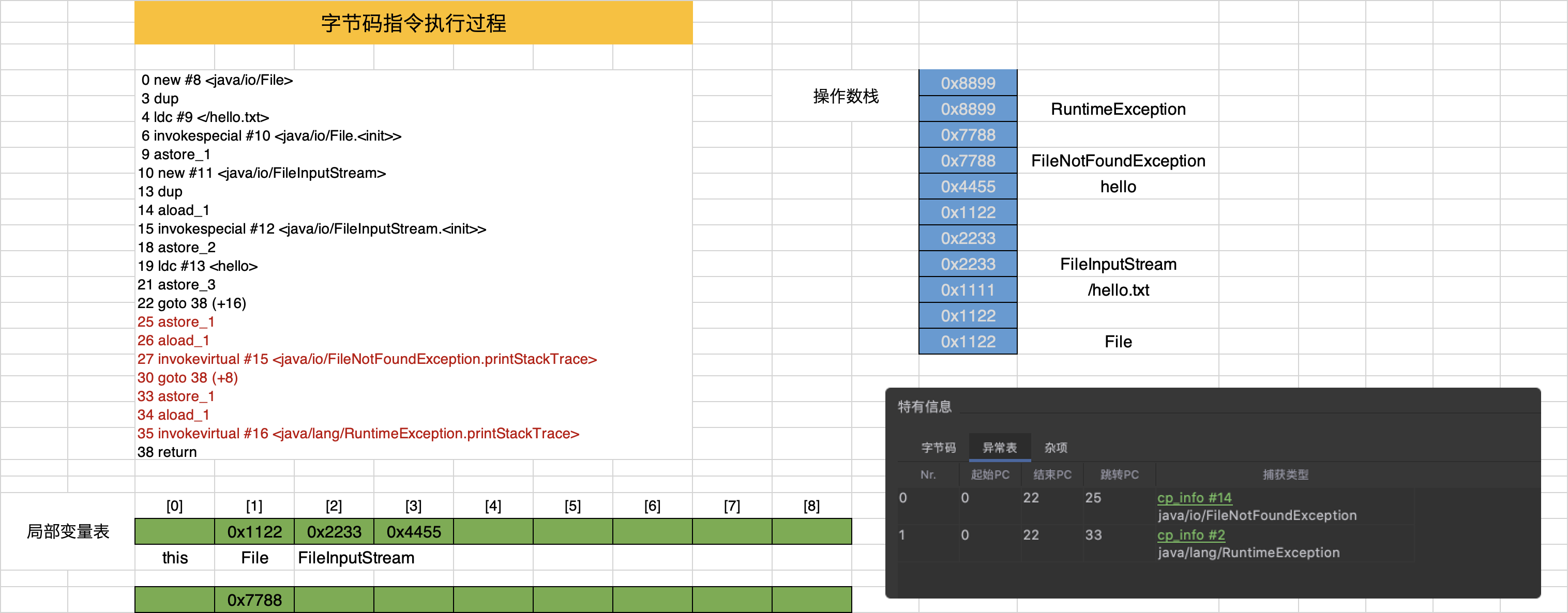 如果一个方法定义了一个try-catch或者try-finally的异常处理,就会创建一个异常表。它包含了每个异常处理或者finally块的信息。异常表保存了每个异常处理信息。比如: