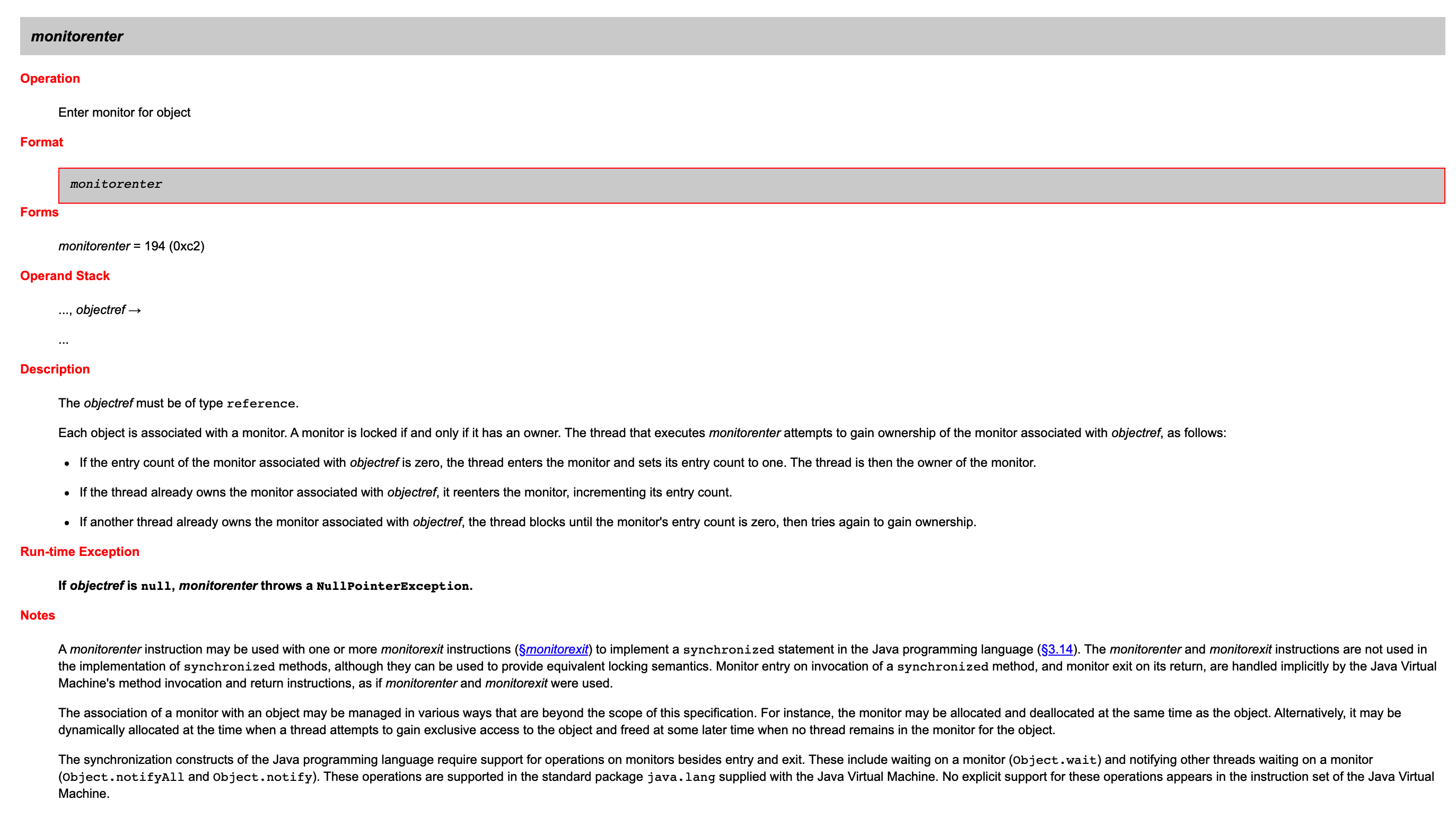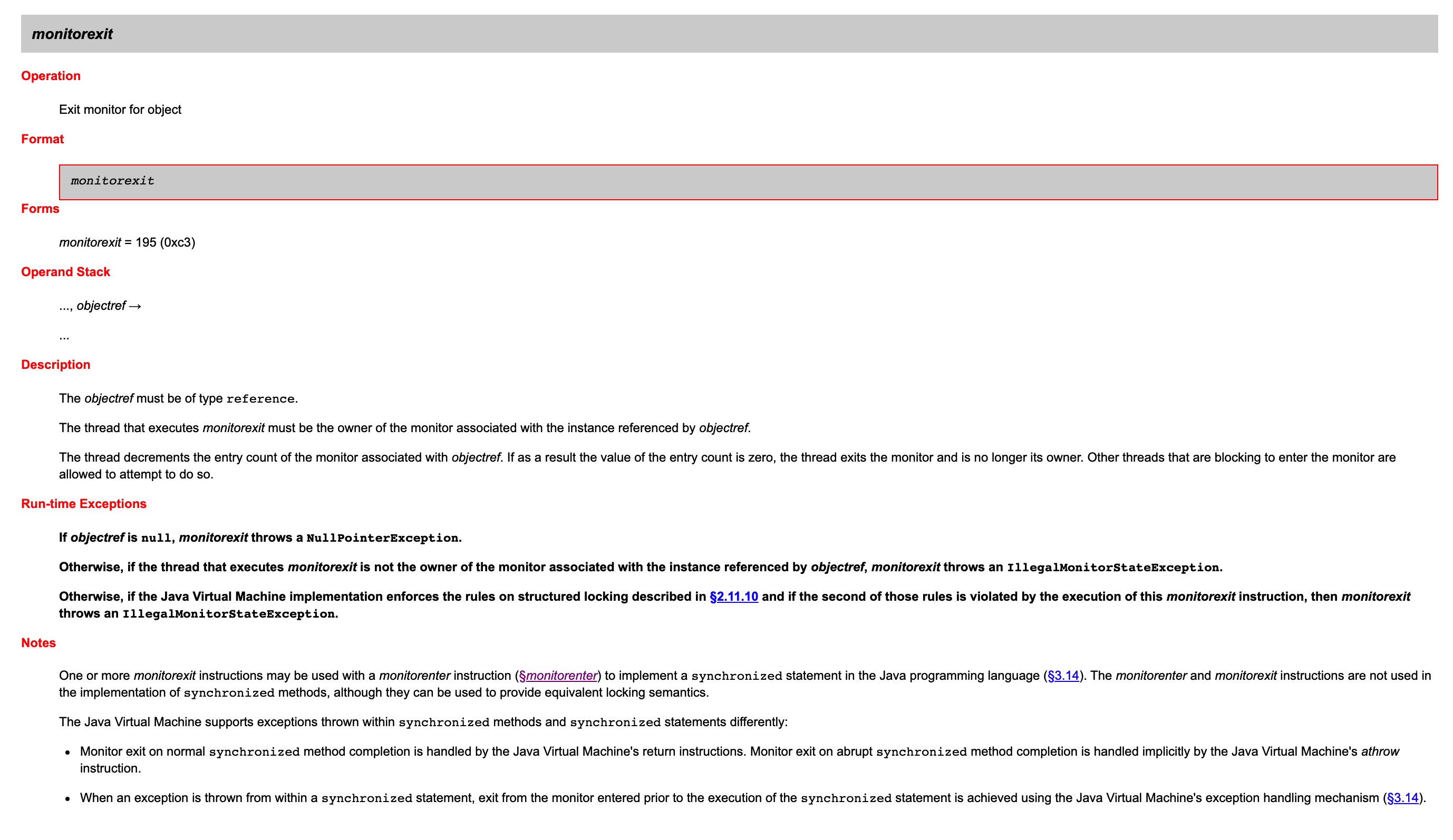 指令monitorenter和monitorexit在执行时,都需要在操作数栈顶压入对象,之后monitorenter和monitorexit的锁定和释放都是针对这个对象的监视器进行的。