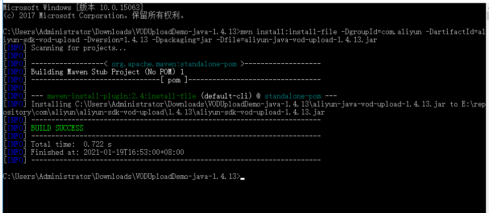 ps:因为现在aliyun-sdk-vod-upload还没有开源,所以需要自己手动下载依赖,在sdk文档中下载依赖的zip后,在cmd命令行中输入命令mvn install:install-file -DgroupId=com.aliyun -DartifactId=aliyun-sdk-vod-upload -Dversion=1.4.13 -Dpackaging=jar -Dfile=aliyun-java-vod-upload-1.4.13.jar,成功后可以导入