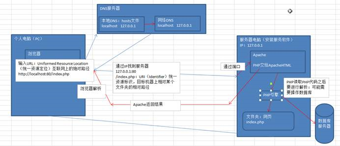 用户输入域名localhost:端口—》DNS(localhost 127.0.0.1)--》服务器电脑—》软件(服务)