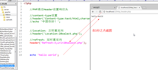 会输出‘hello world’ 但3秒之后又会跳转到了20select.php