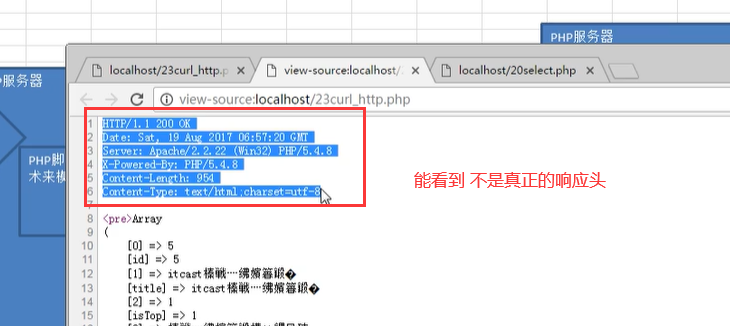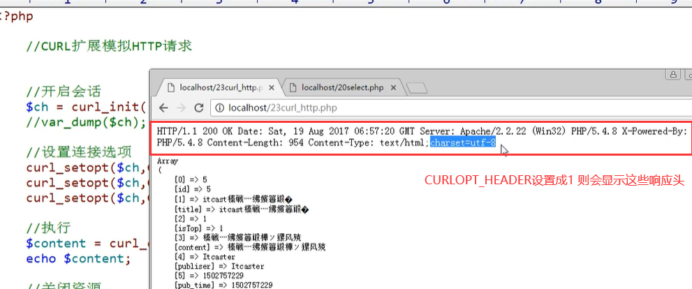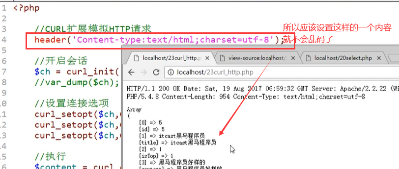 乱码原因:20select.php中的内容有告知浏览器,但是当前是被服务器脚本23curl_http.php访问的,没有做解析;输出给浏览器之后,需要当前23curl_http.php告知浏览器对应的字符集