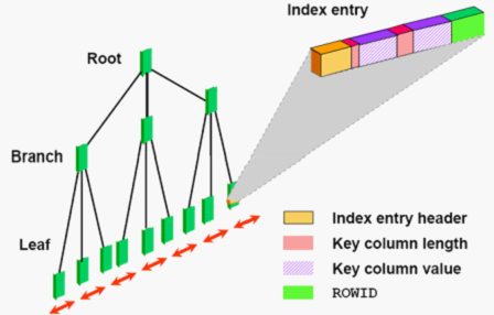按照索引数据的存储方式可以将索引分为B树索引、位图索引、反向键索引和基于函数的索引等,其中B树索引是Oralce数据库中最常用的索引类型(也是默认的),原理如下图,其中Root为根节点,branch 为分支节点,leaf 到最下面一层称为叶子节点。每个节点表示一层,当查找某一数据时先读根节点,再读支节点,最后找到叶子节点。叶子节点会存放index entry (索引入口),每个索引入口对应一条记录。