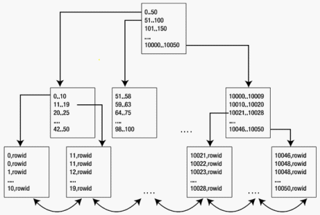 跟节点记录0至50条数据的位置,分支节点进行拆分记录0至10.......42至50,叶子节点记录每条数据的长度和值,并由指针指向具体的数据。