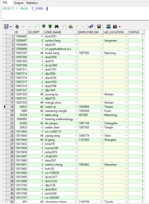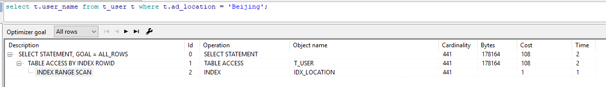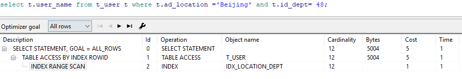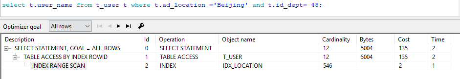 需求2:查询AD_LOCATION为Beijing,且ID_DEPT为48的用户的USER_NAME,SQL语句如下:
