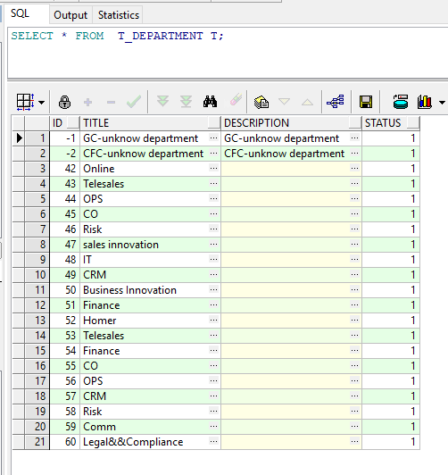 create table T_DEPARTMENT ( id NUMBER not null, title VARCHAR2(100 CHAR) not null, description VARCHAR2(200 CHAR), status NUMBER not null ); alter table T_DEPARTMENT add constraint PK_DEPARTMENT_ID primary key (ID) using index tablespace jay;