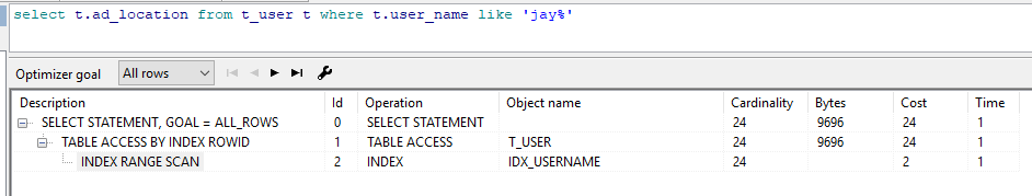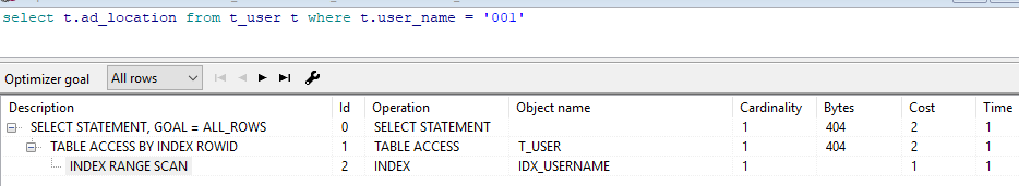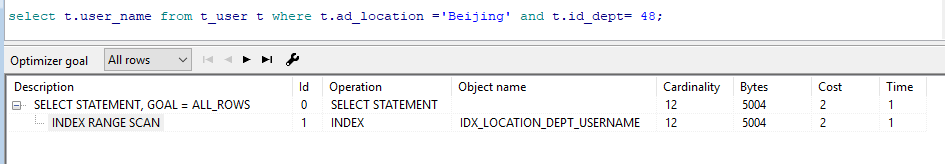 可以看到查询走了复合索引idx_location_dept_username,Cost更小了,而TABLE ACCESS BY INDEX ROWID这一行也消失了,这是因为通过索引找到记录时,select后面的user_name也在索引里面,不需要再通过关联rowid回表查询user_name,所以效率更快。