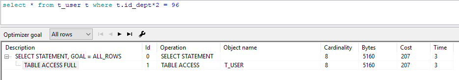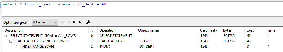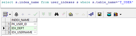 由上图可知目前T_USER表里有两个索引,以IDX_DEPT为例,执行以下SQL: