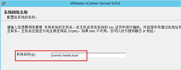 第二步:进入"系统网络名称"对话框,确认名称为‘vCenter.heinfo.local’(来源于计算机名称和DNS后缀),参考下图: